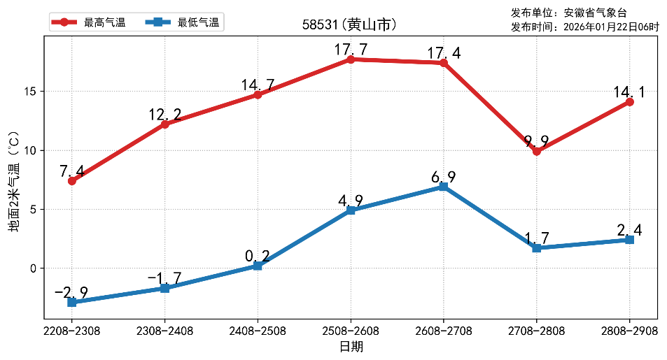 图1 未来一周淮北、合肥、黄山市最高气温与最低气温预报