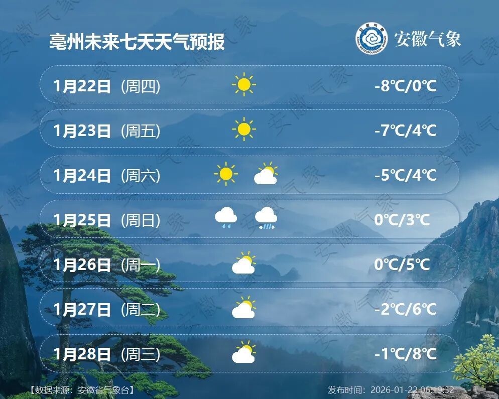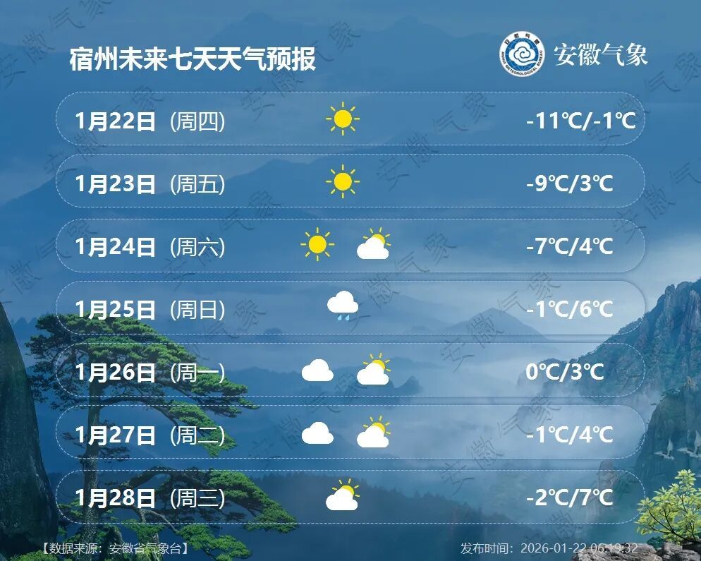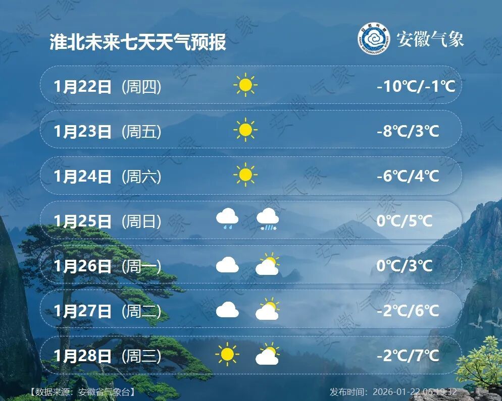25日(周日):江北阴天,大部分地区有小雨,其中淮河以北部分地区有小雨转雨夹雪;江南多云转阴天。