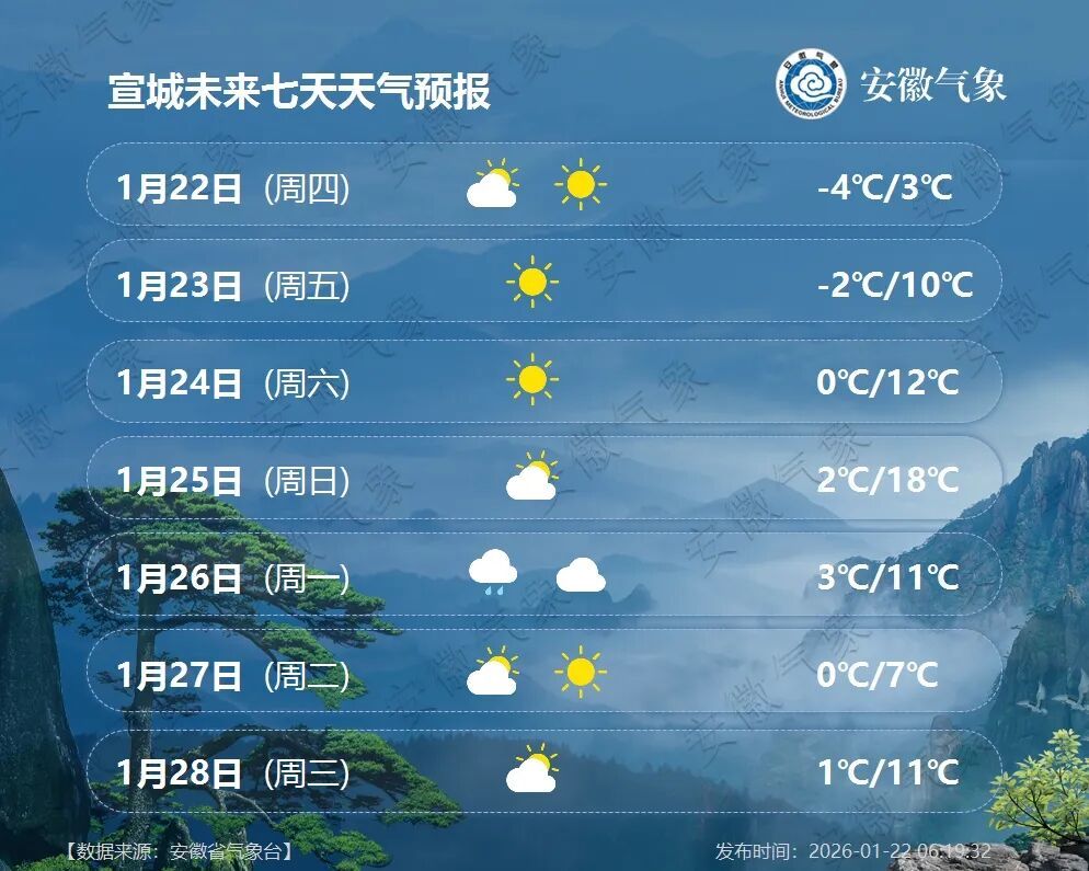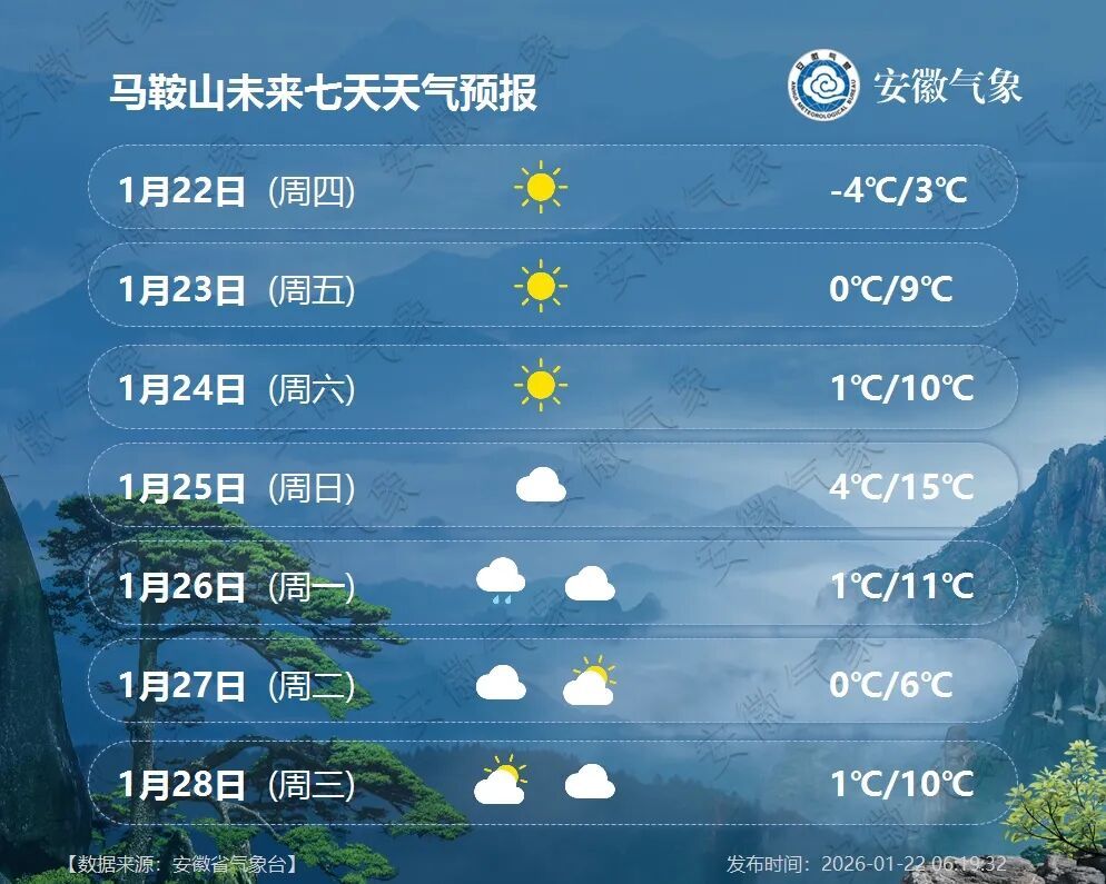 26日(周一):江北阴天到多云;沿江江南阴天有小雨。