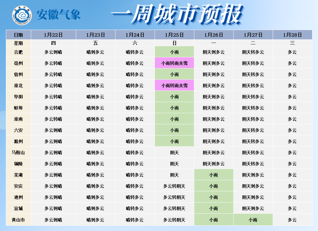 五、安徽主要城市一周天气预报