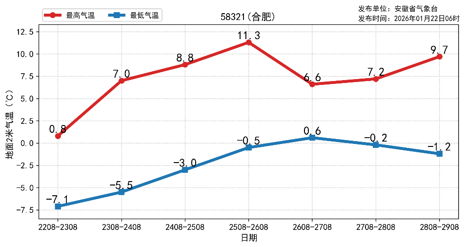 合肥气象消息,今天最高气温:1℃,明天最低气温:-6℃。