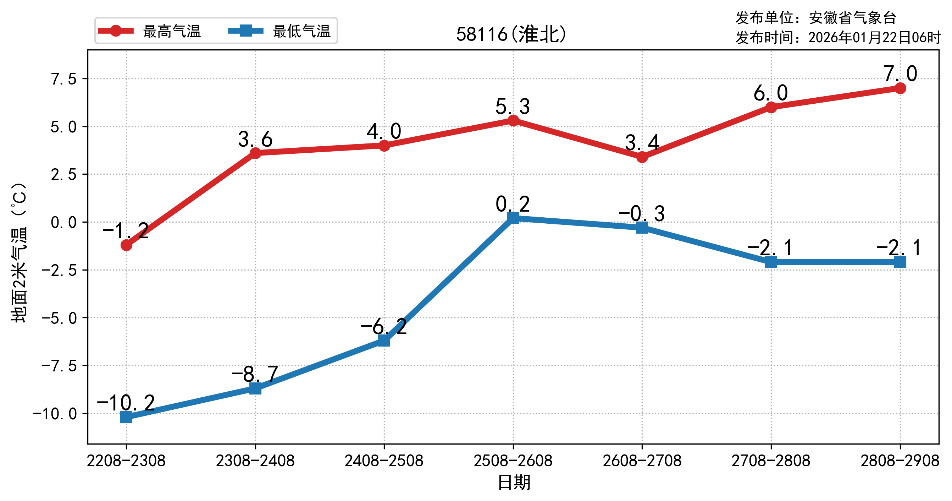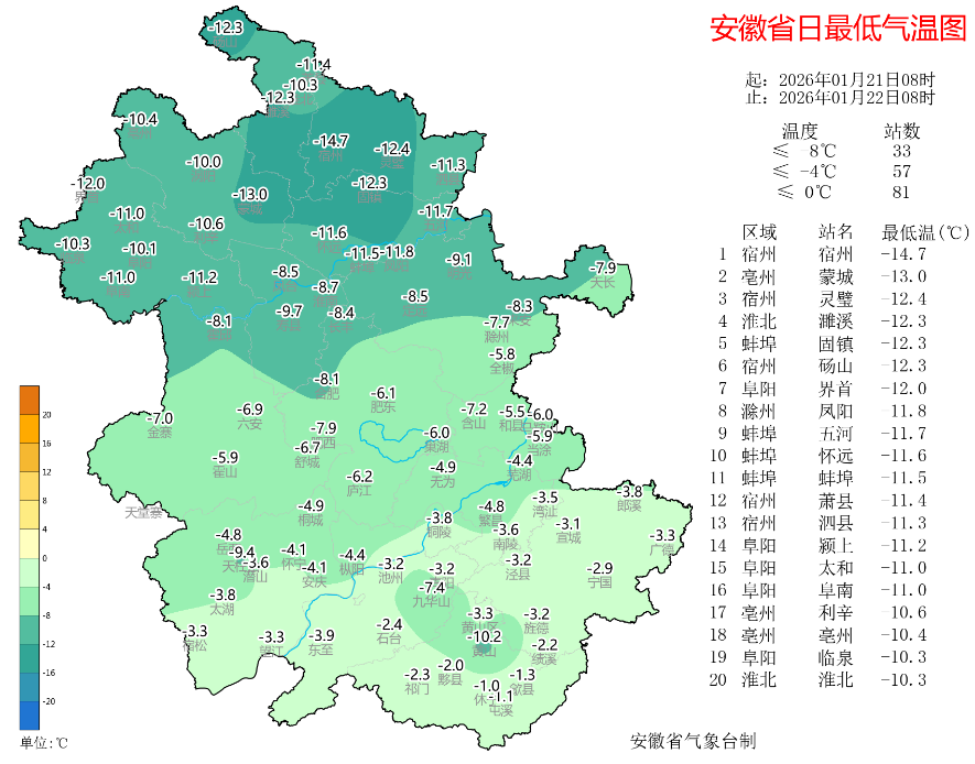 省气象台消息,22-24日全省有持续性低温冰冻天气,明天早晨气温较低,淮河以北最低气温-10~-8℃;江淮之间东部-7~-5℃;江淮之间西部和江南-5~-2℃。