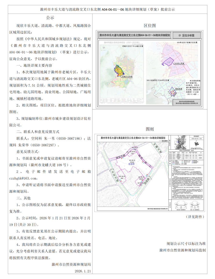 滁州市丰乐大道与清流路交叉口东北侧A04-06-01~06地块详细规划(草案)批前公示