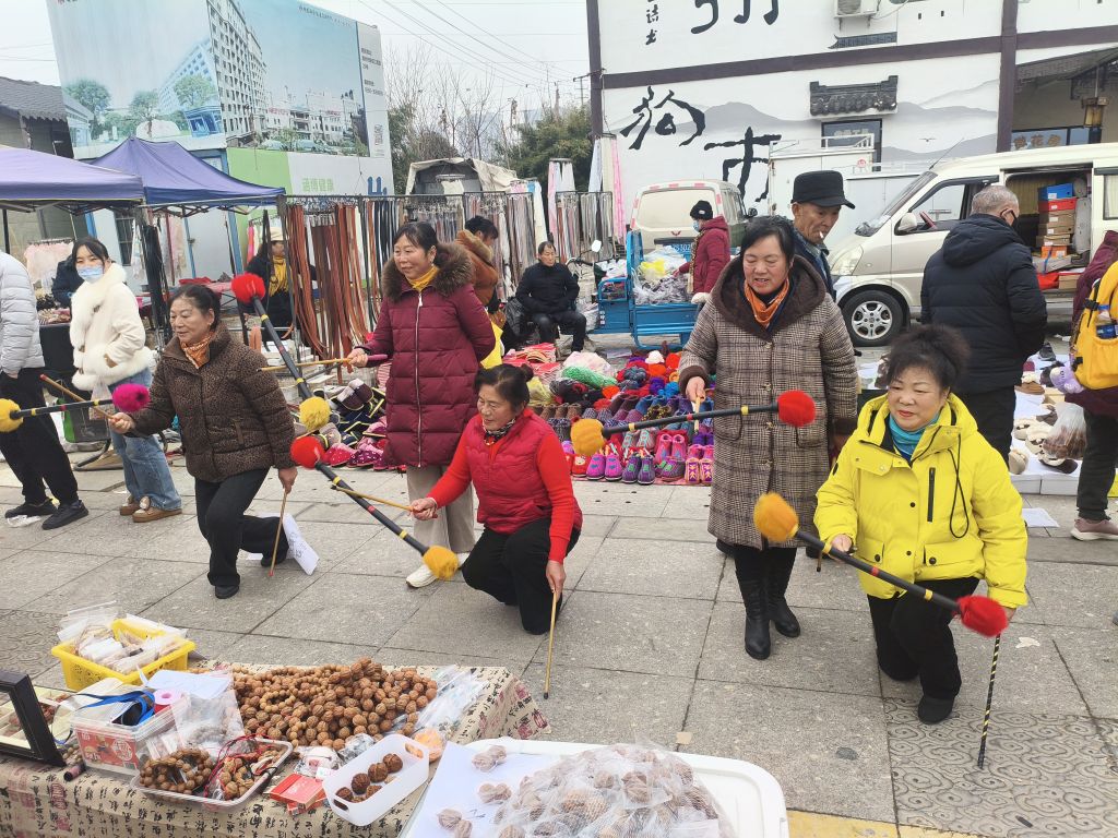 滁州狗市(花鸟鱼虫市场)里的热闹一幕,一群叔叔阿姨正在表演“打花棍”(也叫“打老棍棒”),这是一种兼具健身性和观赏性的民间传统表演。表演者手持带彩色绒球的花棍,配合蹲起、转身等动作,让花棍在身上灵活翻转,动作整齐又充满活力,表演就在摊位之间的空地上进行,周围摆满了皮带、文玩核桃、鞋帽等摊位,充满了浓郁的市井烟火气,是滁州狗市独有的一道风景。“打花棍”原本是老北京的民间技艺,如今在滁州狗市被阿姨们演绎得别有一番风味,成为集市上吸引人气的特色节目。
