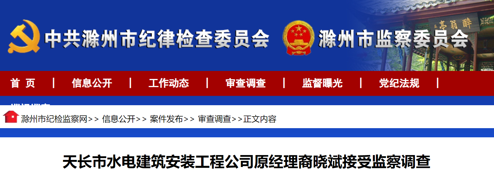 天长市水电建筑安装工程公司原经理裔晓斌涉嫌严重违法,经滁州市监委指定管辖,目前正接受定远县监察委员会监察调查。(滁州市监察委员会)