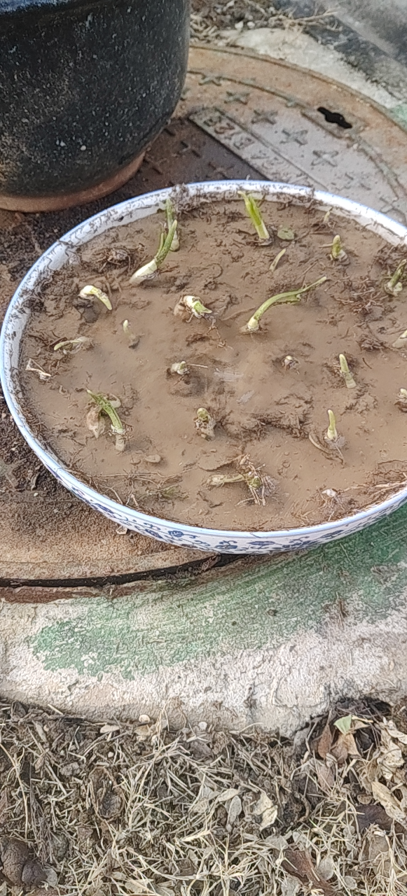 图片很漂亮,一上头就买了水仙花,拿到一看,比蒜瓣子还小,弄点泥土装个盆子,看看后续发展,想放在外面晒晒太阳,昨晚忘了收,冻住了,
