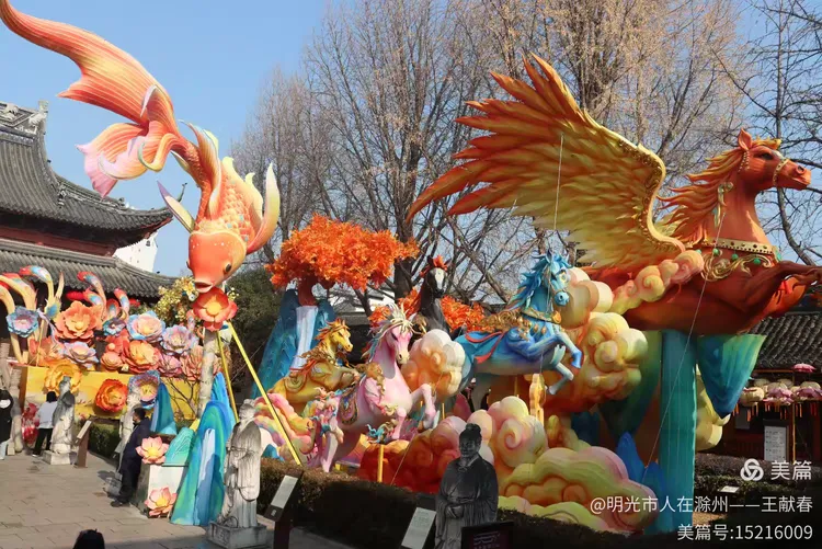 最叫人挪不开眼的,是那只展翅的金凤凰——通体流光,羽尖仿佛还沾着阳光;它脚下,一匹蓝翼飞马腾空而起,矫健得让人屏息;再往左,橙金小鱼弯身一跃,像从《山海经》里游出来似的。花灯不单是灯,是神话在人间落了脚,是古人的梦,被今人一针一线、一光一色,重新绣活了。