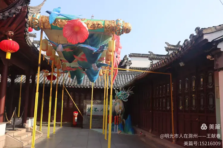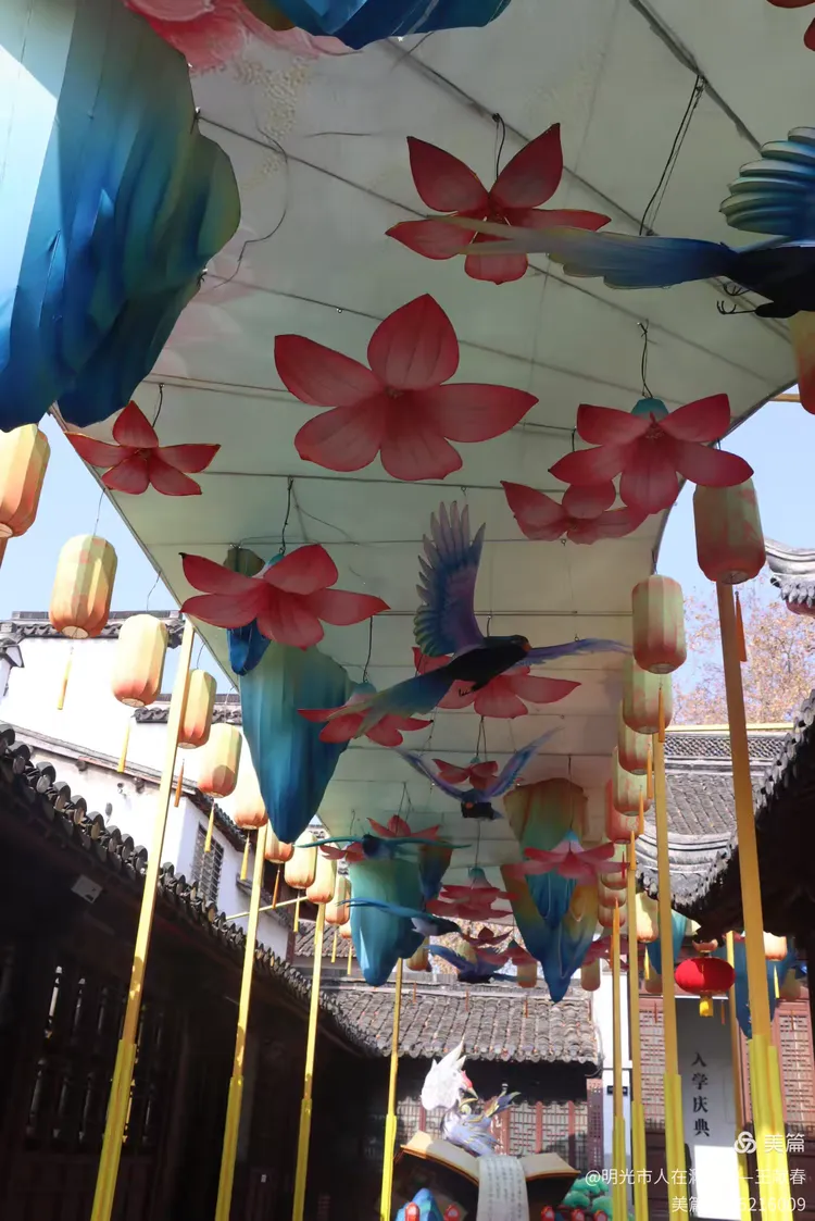 仰头细看,红莲与蓝鸟灯在阳光里愈发鲜亮,花瓣的弧度、鸟羽的走向,都像被光细细描过。飞檐在背景里勾出一道柔韧的线,瓦片泛着微光。那一刻忽然觉得:所谓年味,不过是寻常日子被灯火点亮的一瞬,是眼睛被美撞了一下,心就悄悄软了一角。