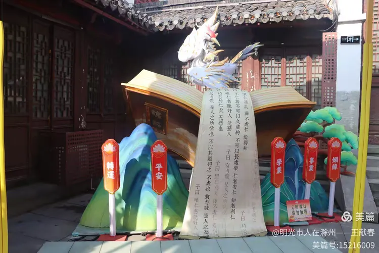 庭院深处,一本巨书静静摊开,书上卧着白兽,山峦环抱,绿树低垂。书旁红牌写着“转运”“平安”“学业”“事业”——不张扬,却把人最朴素的愿望,端端正正写在了光里。我站在书前没说话,只把围巾裹紧了些,风里,仿佛听见了千年前的墨香与今夜的灯语,在同一片屋檐下轻轻应和。