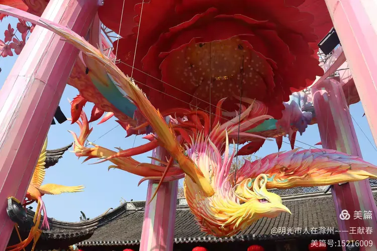 凤凰悬在粉柱之间,羽色由橙渐变至金,翅膀舒展如待风起;它脚下,一朵巨红花层层叠叠,像把整个春天酿成了花蜜。灯笼在檐角轻摇,光晕一圈圈漾开,照见游人脸上未褪的笑意——原来最盛大的灯会,不在别处,就在这抬头一瞬的惊艳里,在这低头一笑的暖意中。