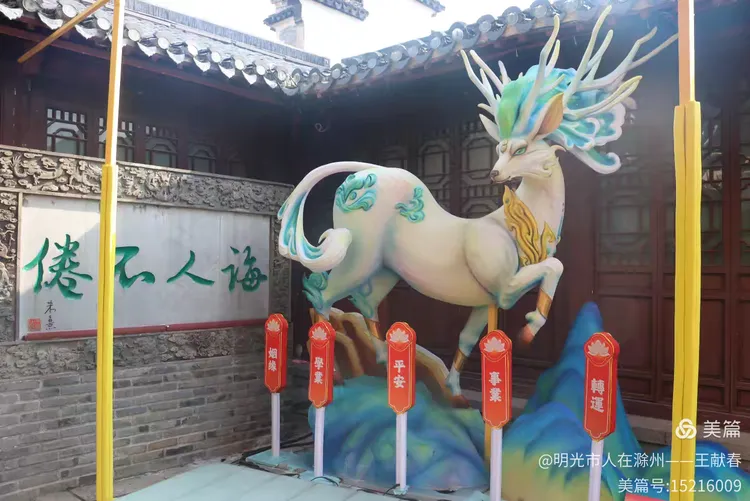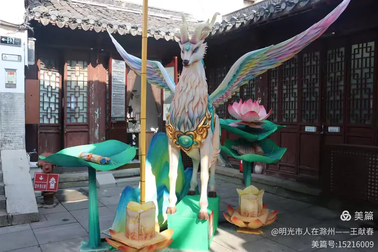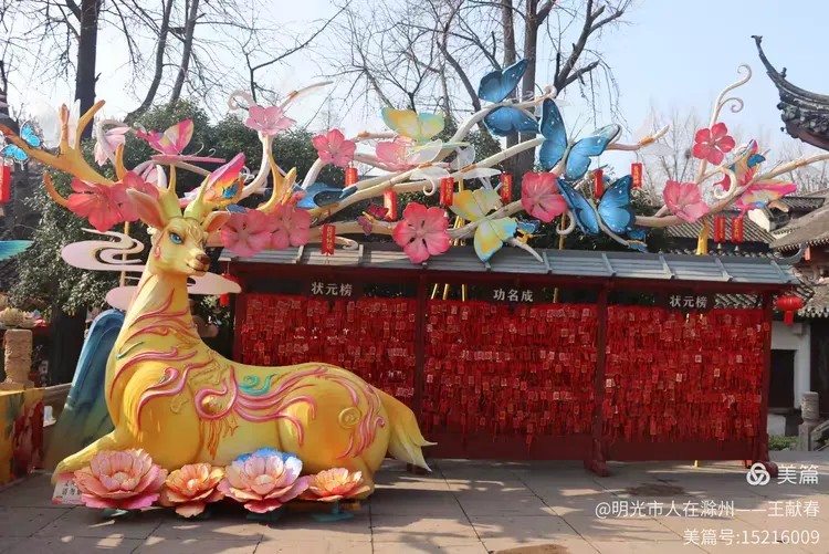 走到一面红墙前,心忽然一软:黄鹿静立中央,鹿角上簪着粉蓝小花,几只蝴蝶绕着飞;它脚下是几朵粉白莲花,再往下,整面墙挂满红祈福牌,上面写着“状元榜”“功名成”。一位中学生模样的女孩踮脚挂上新牌,风吹起她额前碎发——原来最动人的灯,未必最亮,而是照见了人心深处那点温热的盼头。
