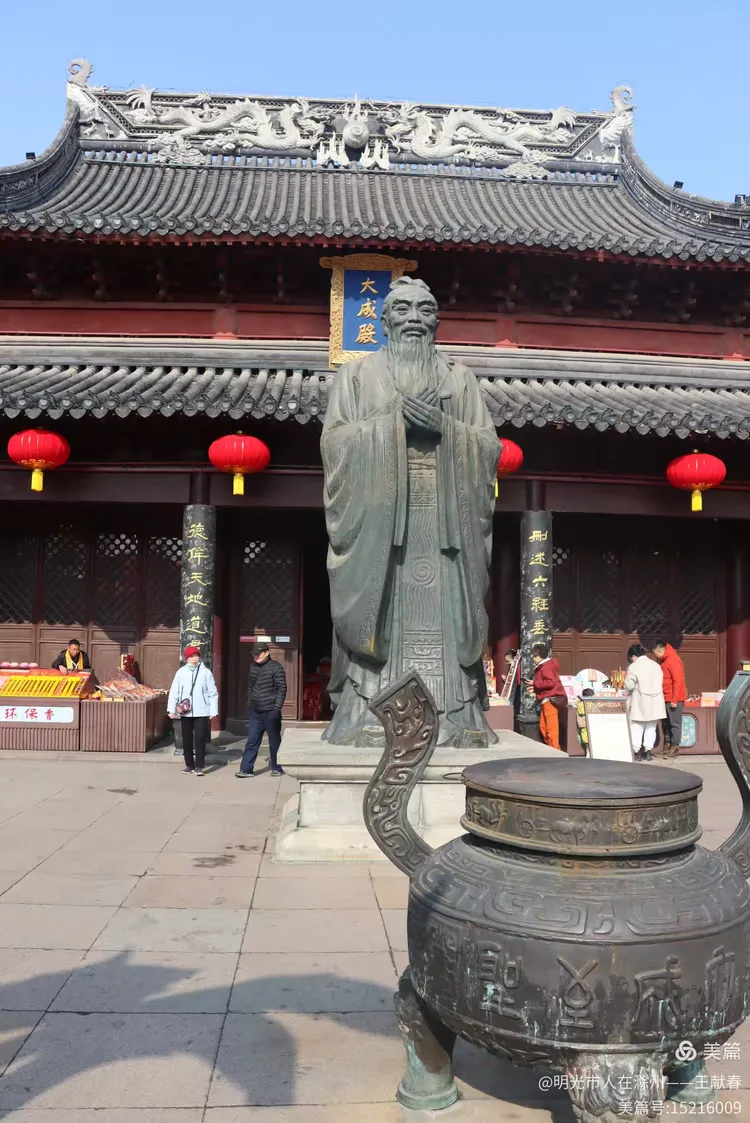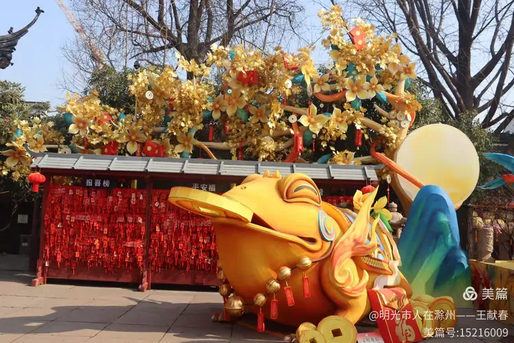 往里走几步,一座黑瓦飞檐的古建静静立在眼前,门前几尊石雕庄重肃穆,檐下悬着两条金灿灿的鲤鱼,鱼尾翘起,仿佛下一秒就要跃入春水。游客们围着拍照,有人踮脚比划着鲤鱼的高度,有人轻声念着“鲤跃龙门”,孩子仰着小脸问:“妈妈,鱼真的能跳过去吗?”——这年味儿,就藏在一句句轻快的问答里。