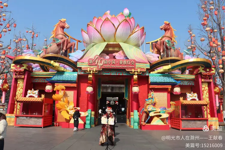 刚踏进夫子庙大成殿分会场,眼前豁然一亮——第40届中国·秦淮灯会的主入口就在这儿!中央那朵硕大的莲花灯璀璨夺目,花瓣层层叠叠,泛着柔润的光晕,两侧金马昂首挺立,神气十足。头顶是蓝得透亮的冬日天空,枝头虽光秃,却衬得满目红灯笼愈发热烈。我们几个朋友刚站定,就忍不住掏出手机合影,连路过的老爷爷也笑着驻足,说:“今年的莲花,比往年更像从画里长出来的。”
