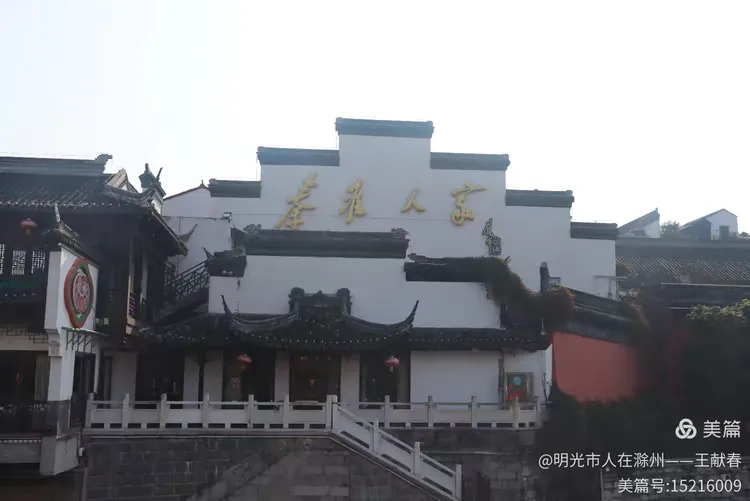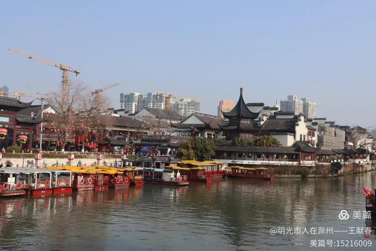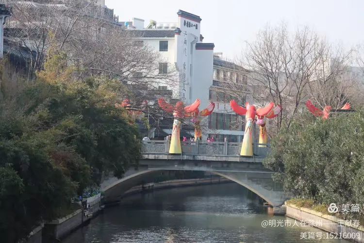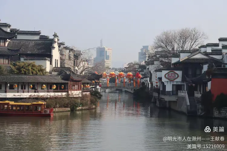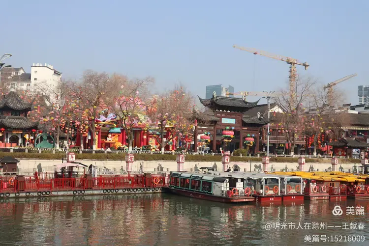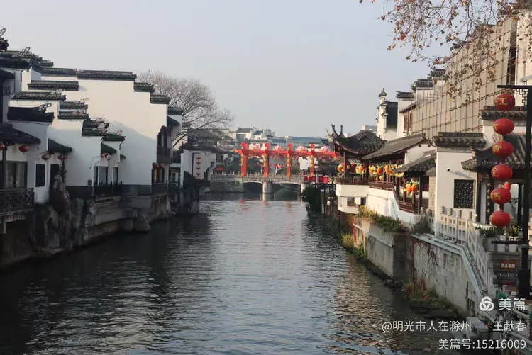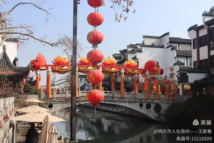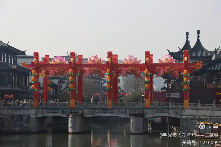 拐过石桥,秦淮河便浮现在眼前。白墙黑瓦倒映水中,红灯笼一盏盏浮在波心,像散落的星子。那座红拱桥也挂满灯,桥那头,一座飞檐翘角的楼阁静默而立,檐角风铃轻响——水是流动的宣纸,灯是未干的朱砂,秦淮,从来都是活的诗。