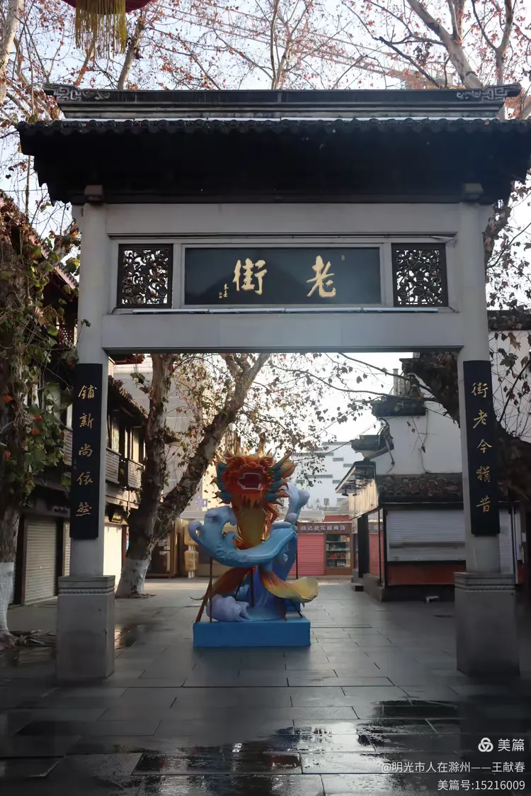 “老街”二字悬于牌坊之上,黑底金字,庄重又亲切。底座上那条彩龙盘踞欲飞,鳞片在灯下泛着幽光;雨后石板微润,倒映着灯笼、飞檐、行人匆匆一瞥的侧影——这老街不声不响,却把岁月酿成了可照见的水。