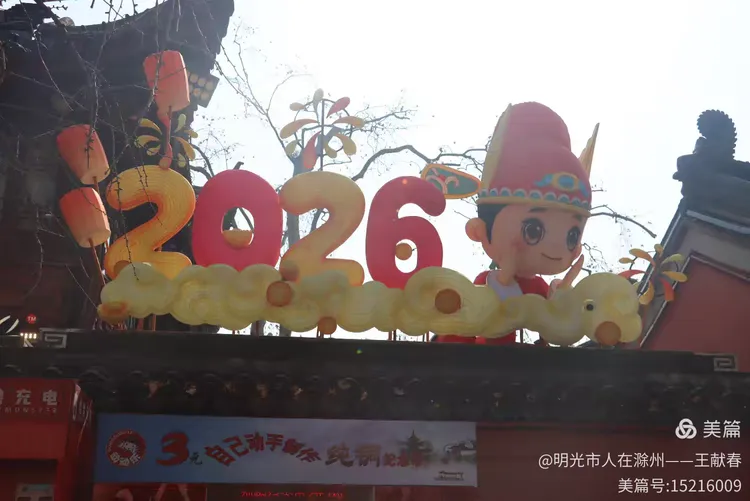 “2026”红字立在祥云之上,卡通人儿戴红帽、咧嘴笑。我绕着它走了半圈,抬头看飞檐,低头看倒影,再转身——身后是灯笼长街,是游船轻摇,是穿汉服拍照的姑娘,是捧糖葫芦跑过的小孩……灯会年年办,而南京,永远年轻。