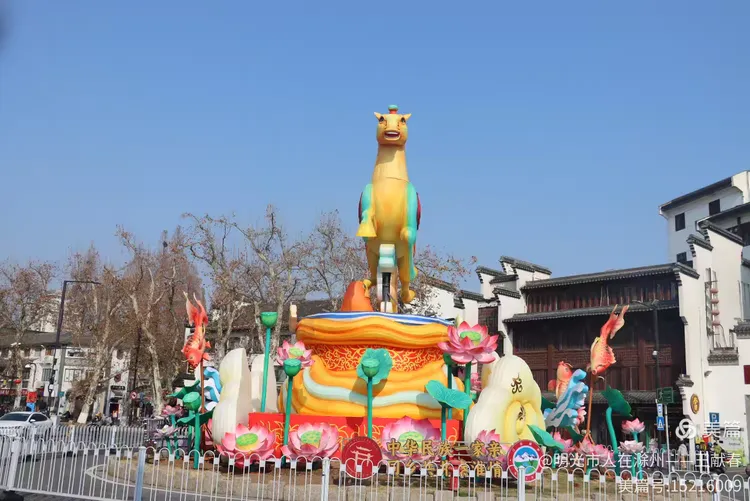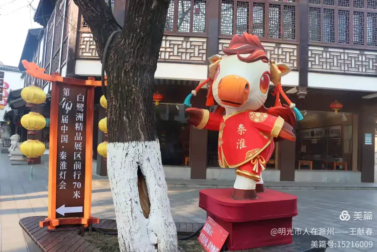一棵刷了白漆的老树旁,立着那只卡通牛:红衣、圆眼、憨态可掬,牛角上还系着小灯笼。橙色指示牌清清楚楚写着“第40届中国·秦淮灯会,70米”。我笑着数步子往前走,心里却想:四十年灯影流转,变的是花灯样式,不变的是这树下驻足、抬头、会心一笑的南京人。