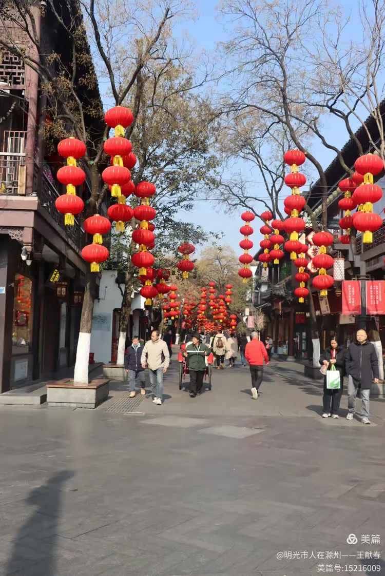 再往里走,是“夫子庙旧书巷”。灯笼悬于枝杈之间,连成一道流动的红廊。我放慢脚步,看光晕在青砖墙上缓缓游移;远处蓝色警务亭静立如守夜人,让热闹有了安稳的底色。书卷气未散,灯影已浓,旧巷新光,原是这般相宜。