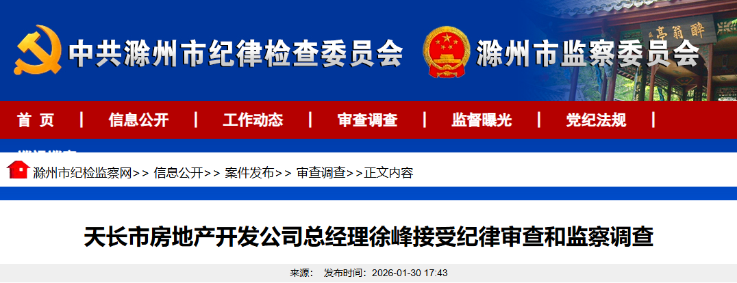 天长市房地产开发公司总经理徐峰涉嫌严重违纪违法,目前正接受天长市纪委监委纪律审查和监察调查。(滁州市纪委监委)