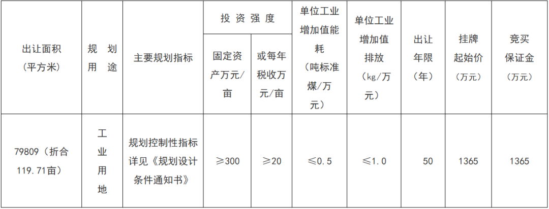 根据《中华人民共和国土地管理法》、《中华人民共和国城市房地产管理法》和《招标拍卖挂牌出让国有建设用地使用权规定》等法律、法规规定,经滁州市人民政府批准,滁州市自然资源和规划局对该宗国有建设用地(工业)使用权进行公开挂牌出让,出让宗地范围内原土地使用权同时收回。现将有关事项公告如下:一、挂牌出让宗地位置、控制指标、起始价、保证金及出让年限宗地位于:胜庄路与滁中路交叉口西南侧,宗地编号:341103008006GB00051。具体情况见下表(宗地详细规划指标及要求请见出让文件)该宗地为“标准地”出让,出让后,在办理国有建设用地使用权首次登记前,中新苏滁高新技术产业开发区管理委员会与竞得人签订《工业项目用地投入产出监管合同》,并进行监管,其他相关职能部门负责对各自职责做好监管。中华人民共和国境内外的自然人、法人和其他组织,除法律法规另有限制者外,均可申请。可以单独申请,也可以联合申请。申请人报名时须提供下列资料:1、竞买申请书;2、企业营业执照副本及复印件;3、法定代表人身份证明及复印件;4、若委托他人代理,须提供授权委托书、委托代理人身份证明及复印件;5、申请人竞买保证金收据。挂牌时间:2026年2月24日上午9时30分开始,至2026年3月6日上午10时整止。挂牌地点:滁州市公共资源交易中心(龙蟠大道109号)。本次公告中宗地挂牌方式为增价报价。挂牌地块以整宗净地出让,挂牌成交价即为土地使用权出让金。土地使用权出让契税等均由竞得人另行缴纳。竞买申请时间:申请人应于2026年2月2日至2026年3月4日(工作日),到中新苏滁高新技术产业开发区土地储备中心领取本次挂牌地块的文件资料,提出竞买申请。移交的净地条件:宗地范围内房屋及构筑物均拆至室内地坪,宗地内地形高程、所有管线、杆线(电线、电缆、光缆等)、沟渠等以及宗地周边供水、排水、供电、道路等基础设施均以成交时现状为准。移交宗地后如竞得人需要平整场地,迁移(或改线)管线、杆线(电线、电缆、光缆等)、沟渠等,所有费用均由竞得人承担。十、本次出让由滁州市自然资源和规划局委托中新苏滁高新技术产业开发区土地储备中心具体承办,并对本《公告》有解释权。传 真:0550-3769016 邮政编码:239000 网 址 :http://zrzyghj.chuzhou.gov.cn/ |