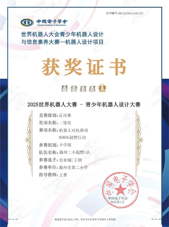 在这场汇聚全球众多优秀青少年科创精英的顶尖赛事中,滁州二小王朔、张如铖、郑宇泽、任妍秋、林弘毅、严梦洁六位同学组成的参赛队伍,带着对科技的热爱与探索的热忱,登上了ROBOG超燃行动机器人对抗赛的竞技舞台。面对来自全国各地的强劲对手,选手们沉着冷静、从容应战,凭借扎实的科技知识、娴熟的实践操作技能以及默契无间的团队协作,精准操控机器人完成各项高难度任务,在激烈的角逐中展现出滁州二小学子卓越的科创素养与顽强的拼搏精神。