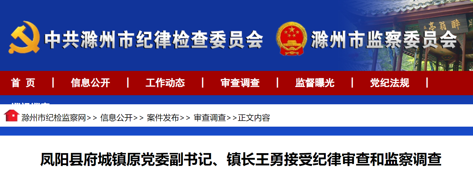 凤阳县府城镇原党委副书记、镇长王勇(副县级)涉嫌严重违纪违法,目前正接受滁州市纪委监委纪律审查和监察调查。(滁州市纪委监委)