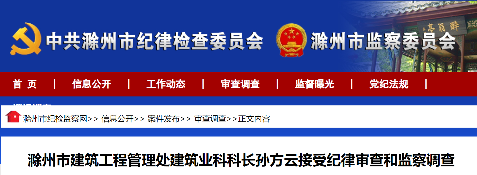 滁州市建筑工程管理处建筑业科科长孙方云涉嫌严重违纪违法,经滁州市纪委监委指定管辖,目前正接受滁州市南谯区纪委监委纪律审查和监察调查。(滁州市纪委监委)