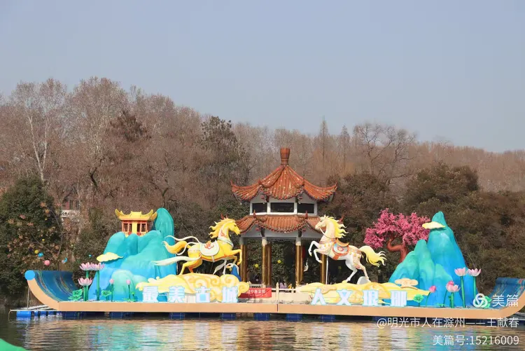 再往湖心望去,一座蓝色平台浮水而立,顶上是一座飞檐翘角的小亭,亭子两侧,两匹金马昂首而立,鬃毛似被风扬起。亭周山形蓝影叠叠,粉花簇簇,连光秃的树影落在平台上,也像被染上了节日的温度。