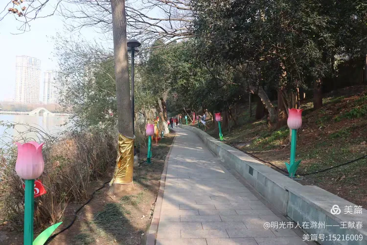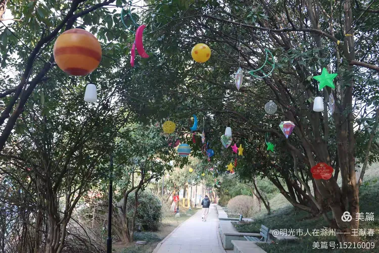 沿着湖边小径慢慢走,绿树虽未浓荫如盖,枝头却已缀满小灯;长椅空着,却像随时等人来坐;一对年轻人并肩走过,影子被夕阳拉得又细又长,融进满路花灯的光晕里。