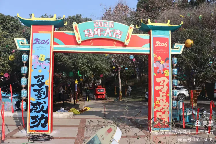 一座中式牌坊横跨步道,朱红底色上“2026 马年大吉”六个大字金光闪闪,两侧柱子上“马到成功”各写一遍,红绸飘动,灯笼低垂。车停在路边,树影婆娑,连空气里都飘着一点甜丝丝的年味。