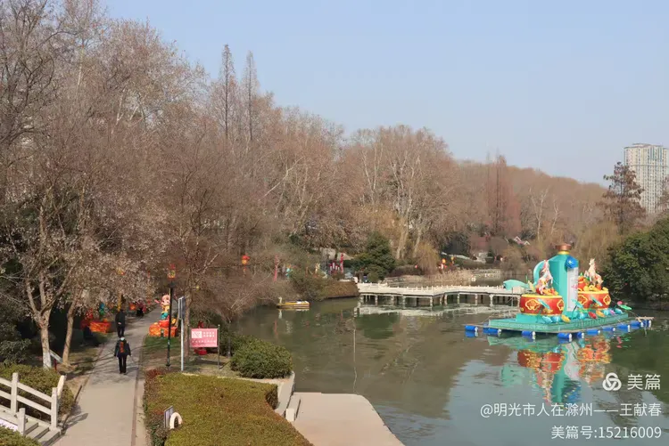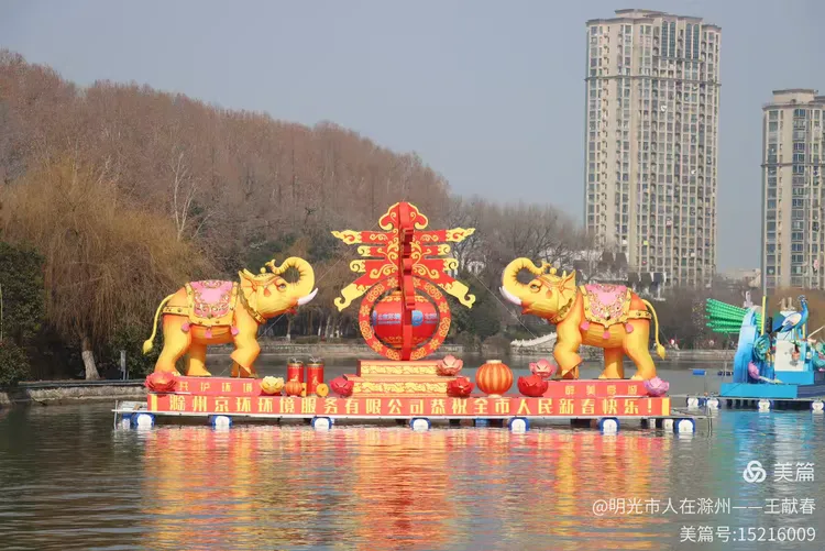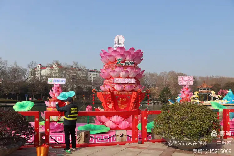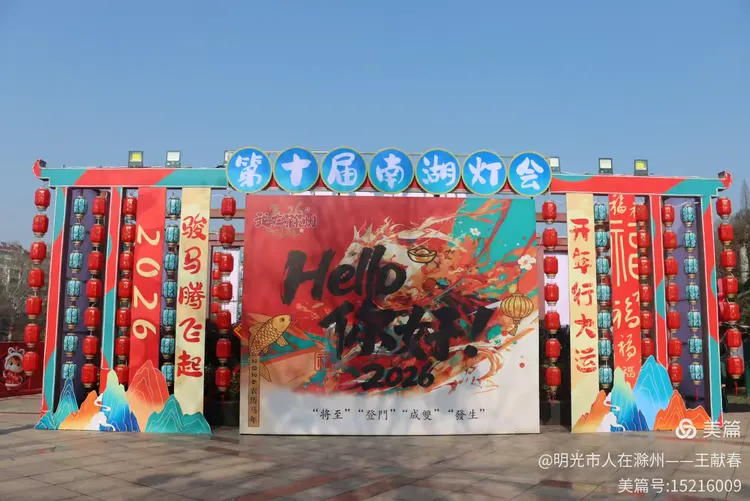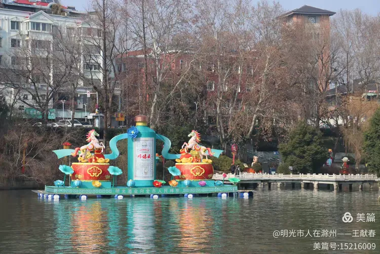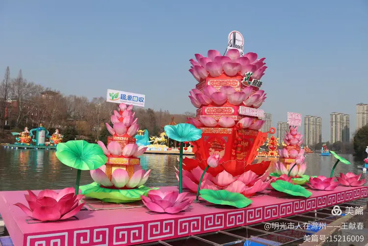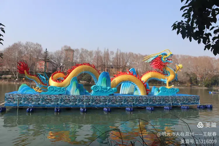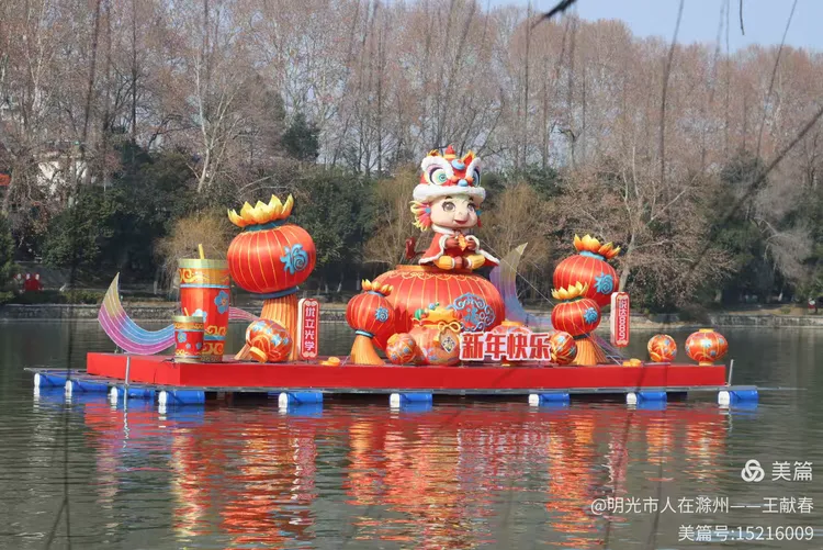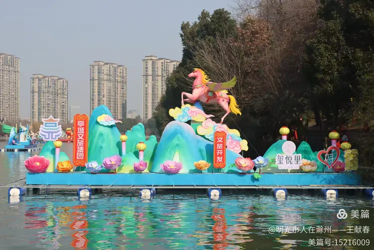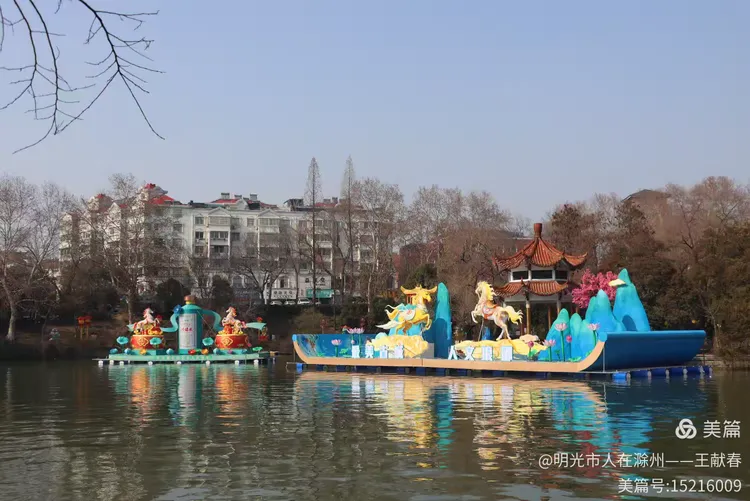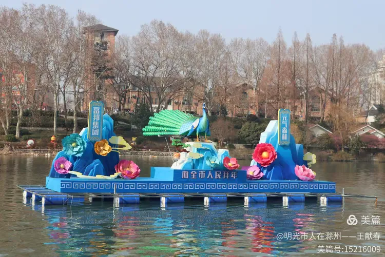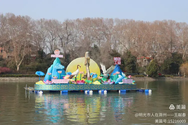 一座蓝黄相间的长形平台浮于湖心,上面雕着莲花、仙鹤与远山——莲是清雅,鹤是高洁,山是恒久。白色浮标如卫士般围在四周,托起这方吉祥天地。我站在岸边望它,忽然觉得,所谓年味,未必是喧天锣鼓,有时就是这一湖静水,托起一朵莲、一只鹤、一座山,托起人们对好日子最朴素的想象。