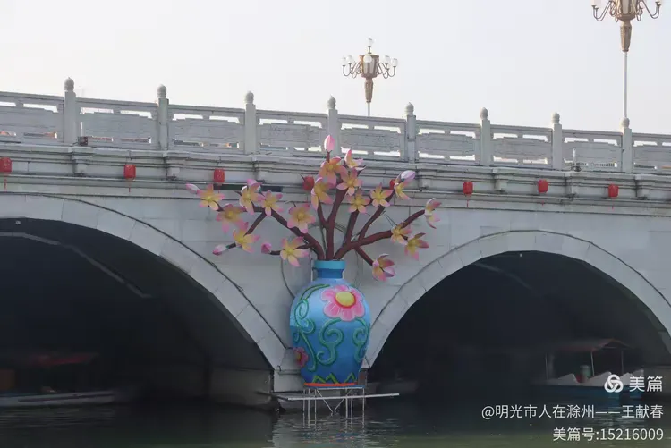 石桥弯弯,桥下水波轻漾。桥头一对青花瓷瓶灯饰立在岸边,瓶身绘着缠枝莲,瓶口插满粉白小花;桥面悬着六盏六角宫灯,光晕温柔地洒在水面,也洒在行人肩头。