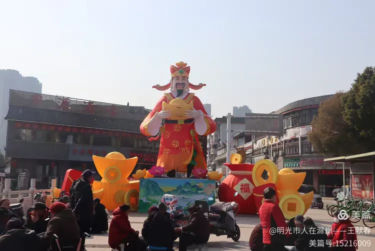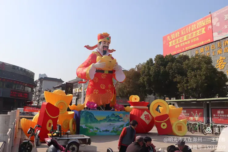 转过小桥,豁然开朗。一条热闹的临湖步道上,一座巨型财神爷花灯正笑迎四方:红袍金边,元宝在手,福气仿佛要从眉梢溢出来。旁边是青砖灰瓦的老式门楼,再往后,几栋现代高楼静静矗立,新与旧在夕阳里握手言和。自行车铃叮当掠过,孩子指着花灯喊“财神爷爷”,老人笑着点头,整条街都浸在一种踏实又欢喜的烟火气里。