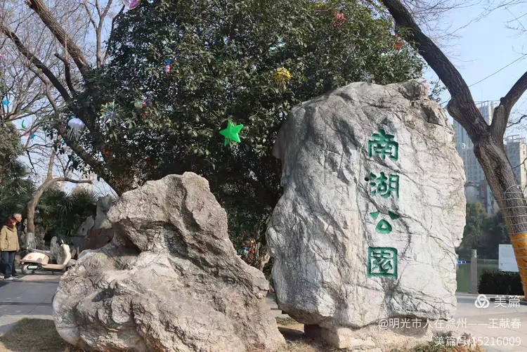 下午三点刚过,我踏进南湖公园门口,两块苍劲的巨石迎面而立,右边那块上刻着“南湖公园”四个青翠欲滴的大字,像一声温厚的招呼。树影斜斜铺在石阶上,枝头垂着一串串红黄蓝的小灯笼和绸带,在微风里轻轻晃,不吵不闹,却把年味悄悄挂到了半空。几个路人慢悠悠踱着,一个穿绿外套的姑娘停下拍照,我也没急着往前走——灯会还没正式亮起,可这入口处的静气,已让人心里先亮了一盏灯。