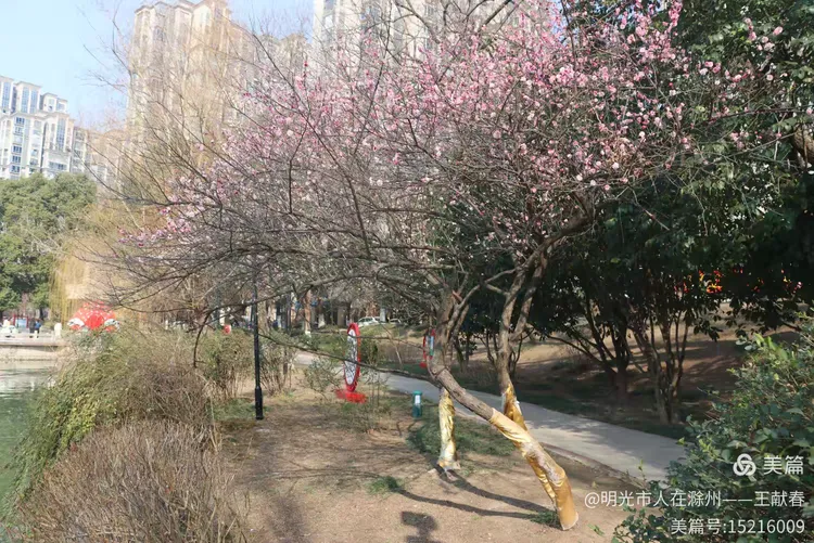 一棵树格外抢眼:满树粉花盛放如云,树干却裹着金箔,在夕阳下闪闪发亮。它不靠灯饰,自己就是一盏灯。我仰头看了好久,风过时,几片花瓣飘落,轻轻落在肩头——原来南湖的春天,早就在灯影与花影之间,悄悄踮脚走来了。