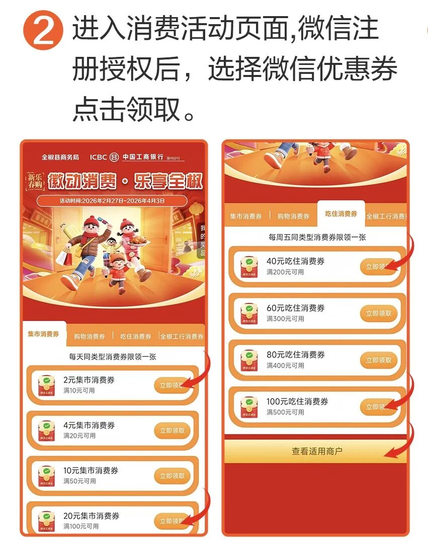 集市消费券:2026年3月1日至2026年3月4日,每天上午9点发放,有效期24小时。