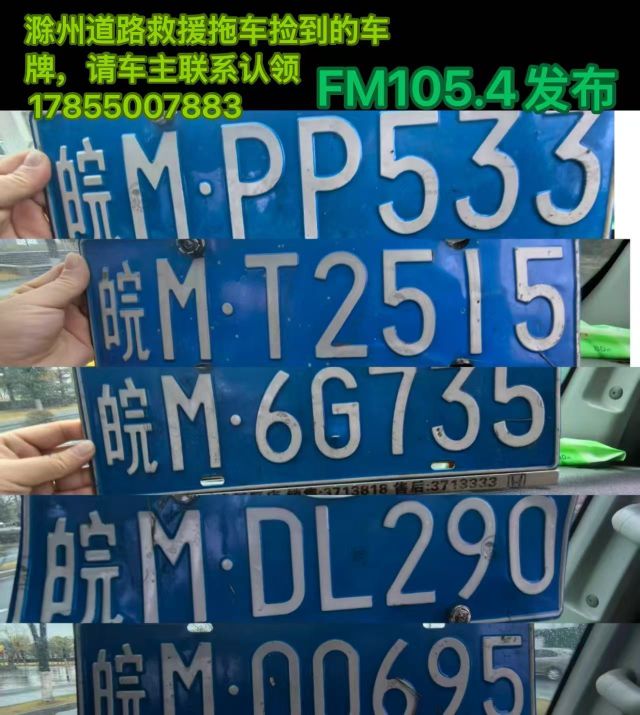 寻车牌认领启事 滁州道路救援拖车在作业中捡到以下车牌,请车主尽快联系认领: - 皖M·PP533- 皖M·T2515- 皖M·6G735- 皖M·DL290- 皖M·00695 认领电话:17855007883 信息来源:FM105.4滁州交通音乐广播 如果您是车主或认识这些车牌的车主,请尽快联系,避免影响车辆使用。也欢迎大家帮忙转发扩散,让失主早日找回车牌