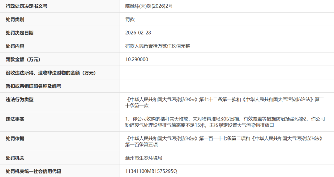近日,据“信用安徽”公开披露行政处罚信息,因未防治扬尘污染、未按规定设置大气污染物排放口,天长市绿燃秸秆加工有限公司被处以罚款10.29万元。行政处罚决定书文号是皖滁环(天)罚(2026)2号。