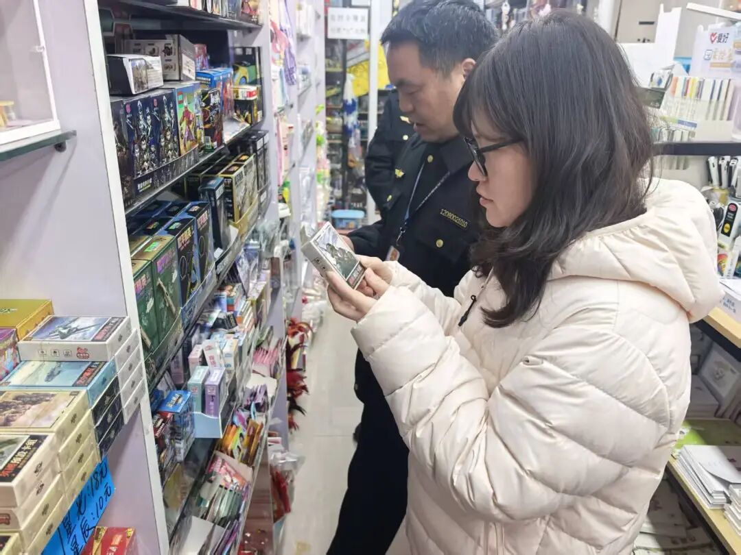 明光市“扫黄打非”办公室组织新闻出版局、文旅局、市场监管局开展校园周边文化市场专项检查,重点检查校园周边文具店、书店营业执照、出版物经营许可证是否齐全,有无低俗玩具、耽美类书籍及盲盒,有无含有妨害未成年人身心健康内容的“口袋书”、卡通漫画、游戏卡片等有害出版物及信息。同时向各经营业主宣传法律法规,督促各商户合法合规经营,主动参与到净化校园文化环境、关爱未成年人健康成长的行动中来。此次专项行动共检查经营场所17家,下架耽美类卡片5盒,收缴刮刮卡100余张,有效净化了辖区市场环境。