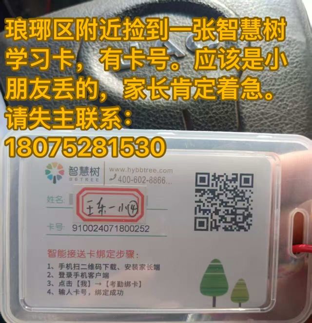 琅琊区附近捡到一张智慧树学习卡,有卡号。应该是小朋友丢的,家长肯定着急。请失主联系:18075281530