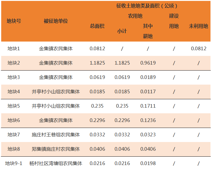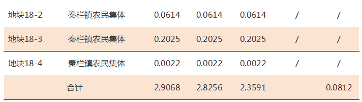 二、土地现状 根据拟征收土地现状调查结果,本次拟征收土地总面积2.9068公顷(43.6020亩),其中农用地2.8256公顷(42.3840亩),含耕地2.3591公顷(35.3865亩),建设用地0公顷(0亩),未利用地0.0812公顷(1.2180亩)。具体情况如下: