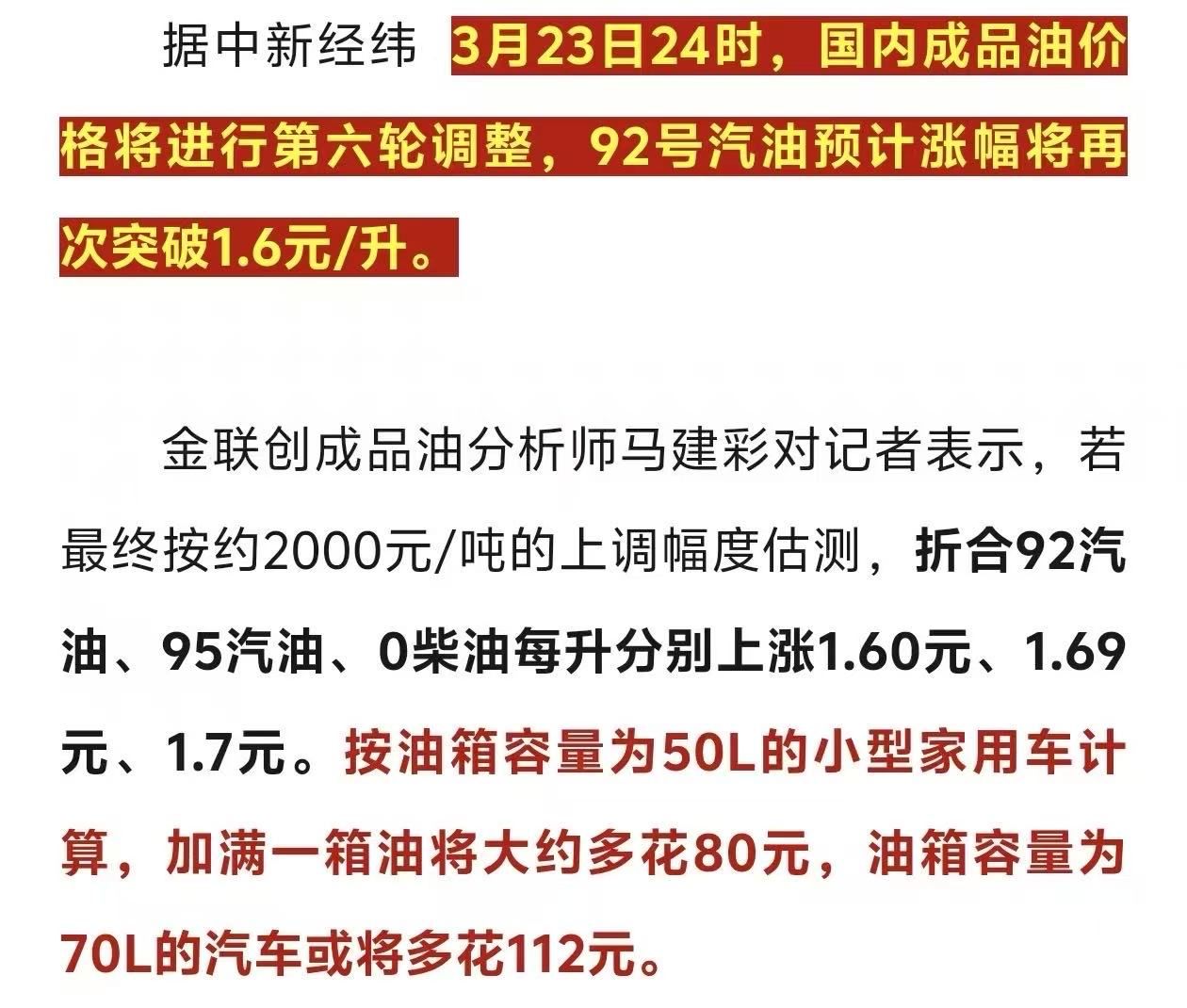 重要提醒!3月23日24时国内油价将迎大幅上调,92号汽油预计涨1.6元/升,加满一箱油多花80元