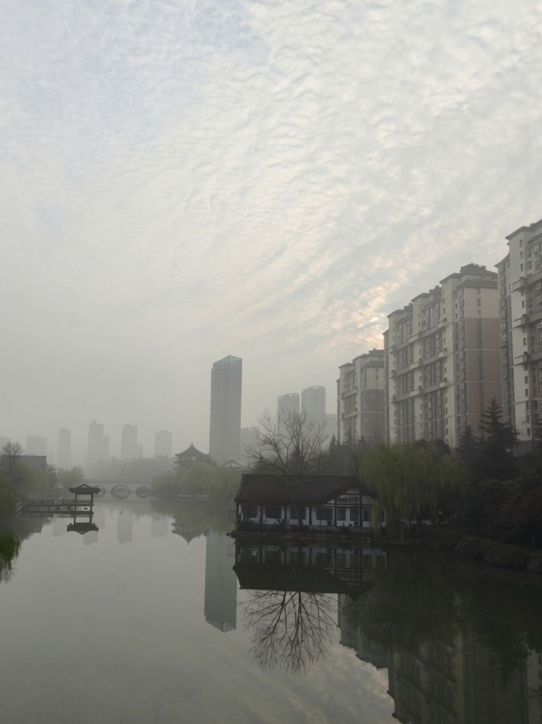 雾很大,湖水刺骨,我在湖心亭画速写,准备毕业设计。