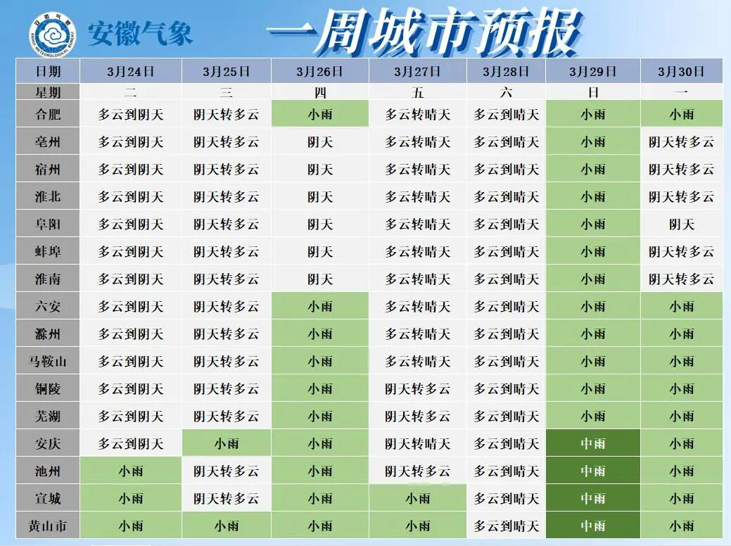 最新消息 中雨即将抵达安徽 安徽气温开始回升 最高可达25℃ 据安徽气象今天消息 3月24-27日 我省南部多阴雨天气 其中26日江南局部有中雨 我省北部以多云到阴天为主 3月29日起 我省还有一次降水过程 气温方面 明天我省气温开始回升 3月29日全省最高气温 江北20~22℃,江南23~25℃ 3月30日前后 还有弱冷空气影响我省 看完安徽再看滁州 据滁州市气象局气象专报 预计今日我市云系较多 明晨我市有大雾天气 3月26日和3月29-30日 有降雨天气过程 具体预报 ↓↓↓ 3月24日 阴天,11~16℃ 3月25日 多云到阴,7~20℃ 3月26日 多云转阴有小雨,10~20℃ 3月27日 多云转晴,11~19℃ 3月28日 多云,8~21℃ 3月29日 多云转阴有小雨,11~20℃ 3月30日 阴有小雨,14~18℃ 尽管气温开始回升 但昼夜温差仍然较大 建议采用“洋葱式”穿搭哦~ 来源:安徽气象、滁州市气象局