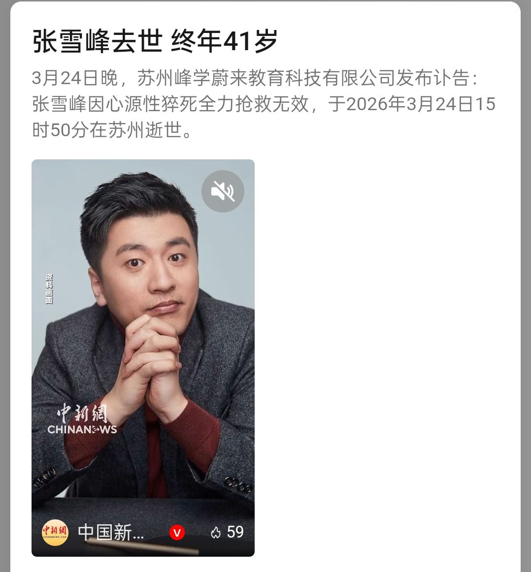3月24日晚,苏州峰学蔚来教育科技有限公司发布讣告:张雪峰因心源性猝死全力抢救无效,于2026年3月24日15时50分在苏州逝世。