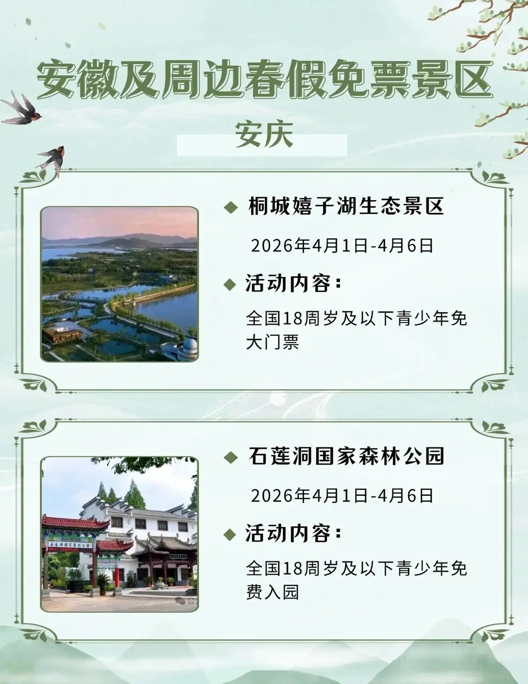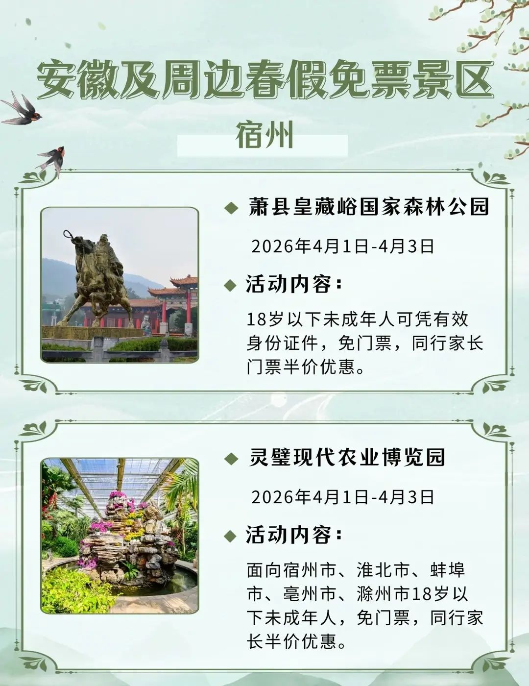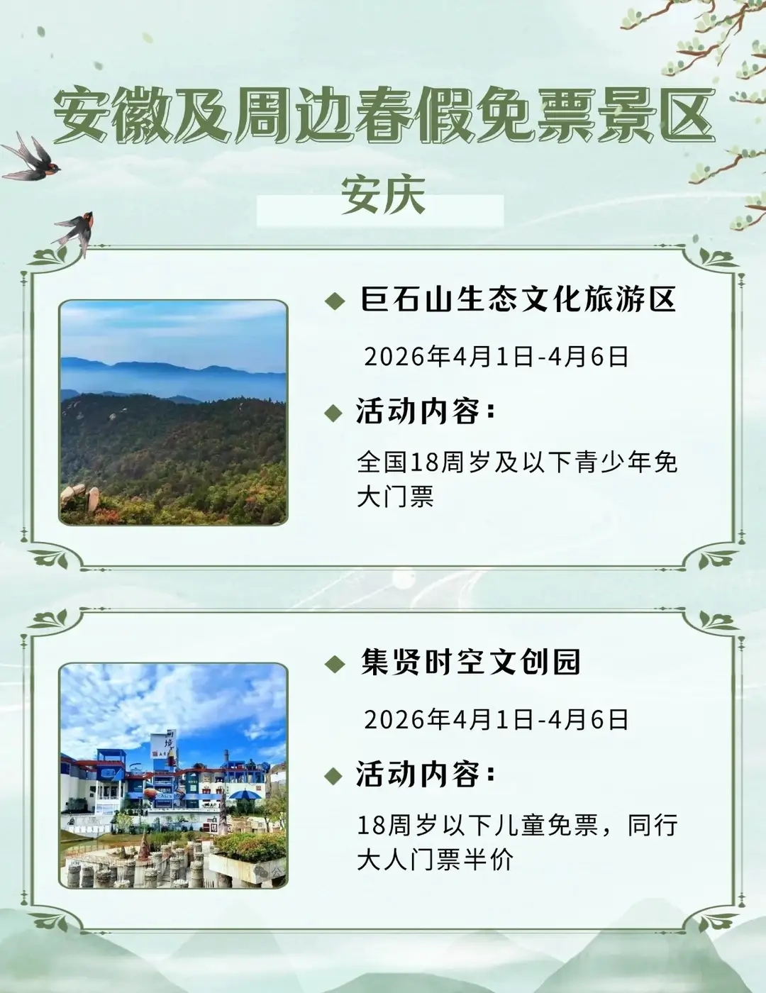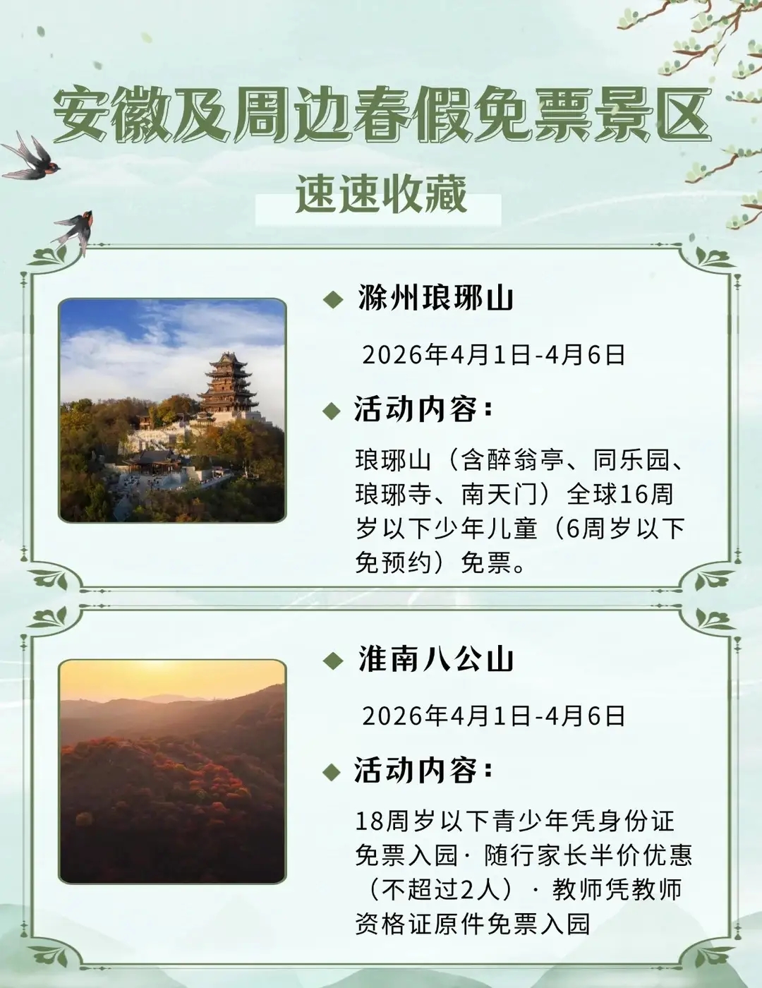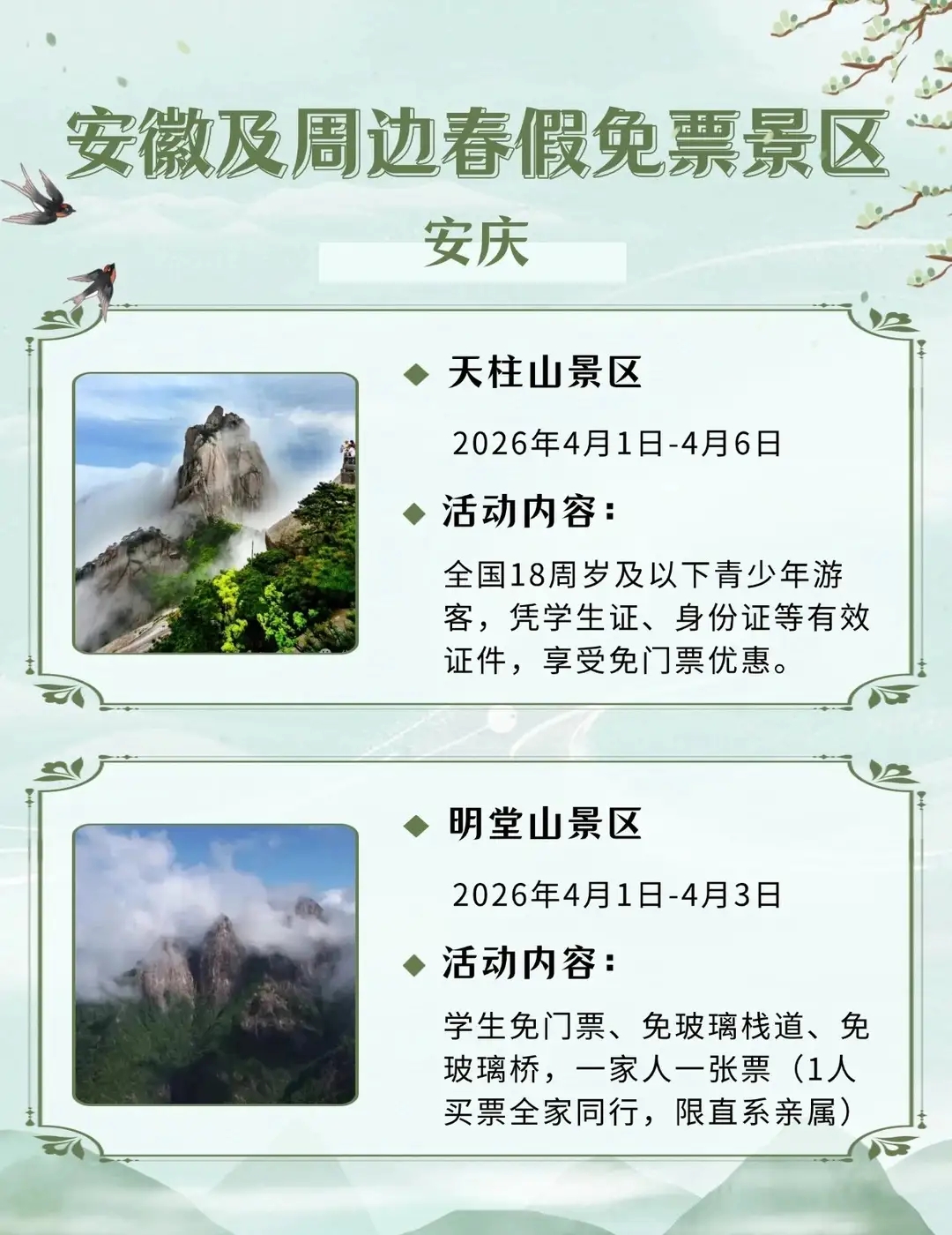 安徽及周边这些景区春假对娃免票,速速收藏2026年安徽首个“春秋假”来啦!4月1日-3日春假+4月4日-6日清明,连休6天!你会带娃出游吗?你单位放几天假?