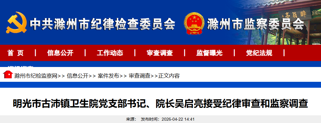 明光市古沛镇卫生院党支部书记、院长吴启亮涉嫌严重违纪违法,目前正接受明光市纪委监委纪律审查和监察调查。(滁州市纪委监委)